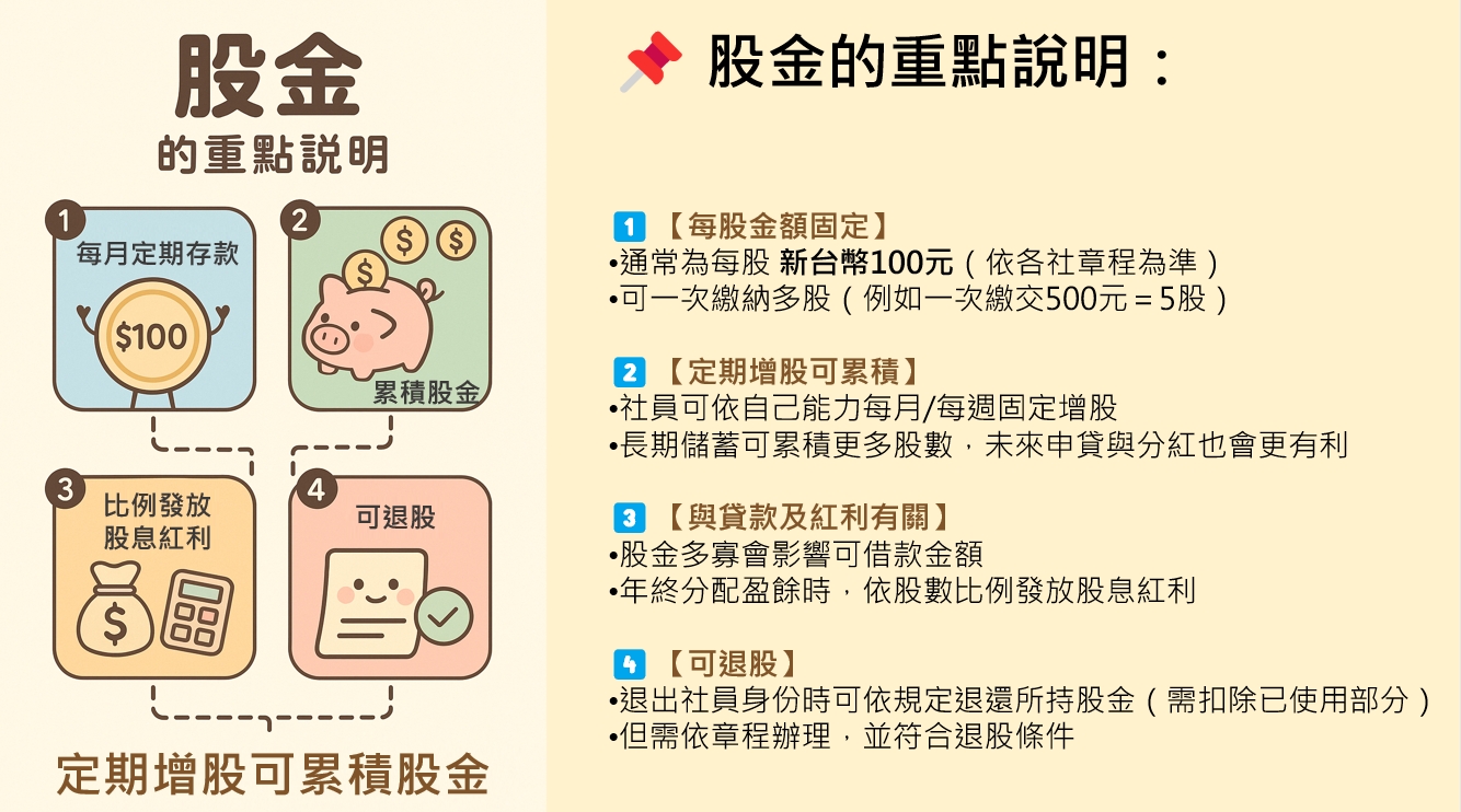 - 加入儲蓄互助社需要繳納入社費和最低股金。入社費是一次性費用,用於支付行政成本;最低股金是您在儲蓄互助社的基本存款,也是您社員身份的象徵。