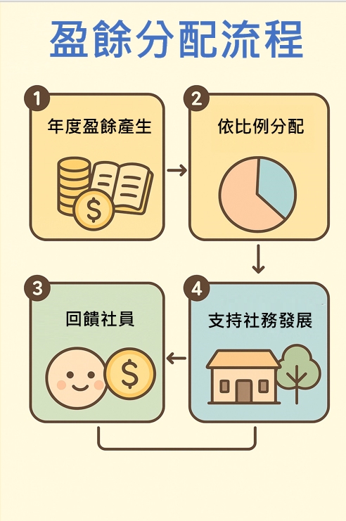 - 5盈餘分配予社員:儲蓄互助社應鼓勵社員勤儉儲蓄以提供貸款及其他服務,社員認股應就社能力範圍內支付相當的股息。社扣除經營開支後所得盈餘,除提撥法定公積金及支付規定之股息外,應歸還於全體社員及為社員使用,並應避免為個人或部分社員的利益而損害其他社員。盈餘得按社員交易額分配(包括股息或利息攤還)或應用於社員所要求的改進或他項服務。